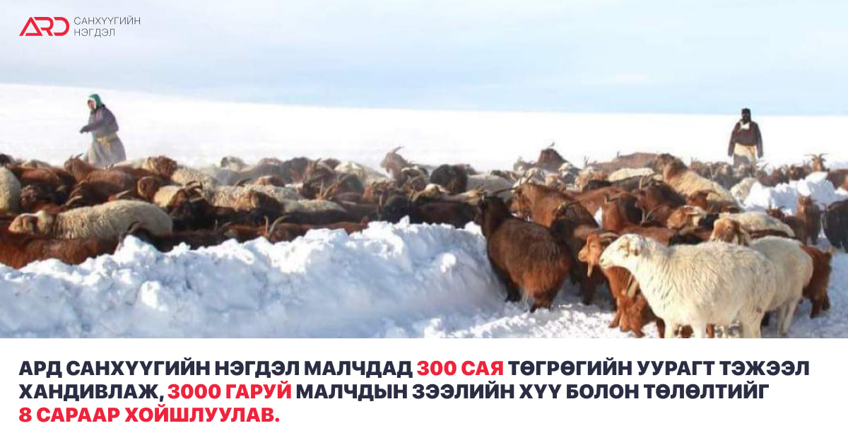 Ард Санхүүгийн Нэгдэл нь өөрсдийн санхүүжүүлдэг СКОПА төслийн хүрээнд 2022 оноос эхлэн малчдад зээл олгосоор ирсэн билээ. Тэгвэл Монгол Улсад зудын бодит эрсдэл бий болж, хаваржилт хүндэрч байгаа энэ үед Ард Санхүүгийн Нэгдлийн зүгээс малчдаа дэмжсэн арга хэмжээ авахаар шийдвэрлэлээ. Уг шийдвэрийн хүрээнд малчдын зээлдээ хөнгөлөлт үзүүлж, хүү болон үндсэн төлбөрийг 2024 оны 2 сарын 23-наас эхлэн 8 сарын хугацаатай хойшлуулахаас гадна 300 сая төгрөгийн үнэ бүхий уураг болон эрдсийн агууламж өндөр малын тэжээлийг хандивлаж байна. Улсын Онцгой Комиссын мэдээлснээр энэ сарын 19-ний өдрийн байдлаар улсын хэмжээнд 5 аймгийн 22 суманд “төмөр буюу шилэн зуд”, 18 аймгийн 90 суманд “цагаан зуд” нүүрлэж, нийт 20 аймгийн 192 сум, нийслэлийн 2 дүүрэгт өвөлжилт хүндэрч, өнөөдрийн байдлаар 1.5 сая мал хорогдоод байна. Иймээс эхний ээлжид зудын хүндрэл өндөртэй байгаа аймгуудын сум, багуудаар байршуулсан байгаа агуулахаас уургийн агууламж өндөр тэжээлийг малчдын гар дээр шууд дэмжлэг болгон хандивлахаар болов. Бид 2021 оны 8 сараас эхлэн СКОП Аллианс компанитай хамтран Монгол Улсад анх удаа нийлүүлэлтийн гинжин хэлхээний ГҮҮД платформыг нэвтрүүлэн санхүүжилтийн таатай нөхцлөөр бүтээгдэхүүн, үйлчилгээний хүртээмжийг нэмэгдүүлэх, малчдад малын тэжээлийн зээлийг таатай нөхцөлөөр олгох, бараа бүтээгдэхүүний түгээлт, борлуулалтын сувгийн цогц шийдлийг бүрдүүлэн ажиллаж ирсэн билээ. Малчид уурагт тэжээлийг Багийн дарга, Монгол Шуудангийн шууданчдад хандан малын тэжээлийн зээлээ хөнгөлөлттэй нөхцлөөр авах боломжийг бүрдүүлсэний хүрээнд Ард Кредит ББСБ ХК Нийлүүлэлтийн гинжин хэлхээний СКОПА төслийн хүрээнд нийт 3500 харилцагч байгууллага, 3000 гаруй малчдад эхний 45 хоног хүүгүй, таатай нөхцлөөр санхүүжилтийг олгон ажилладаг юм. Ард Санхүүгийн Нэгдлийн санхүүжилттэй Майнд Тек нь Рапс (Юнгар) хэмээх тосны ургамлын шахдаснаас 40% уургийн агууламж бүхий уурагт тэжээлийг гарган авч, малд нэн шаардлагатай байгаа уургыг нөхөх мөн олон төрлийн сөрөг нөлөөг арилгах олон талын ашиг шимтэй уурагт тэжээлийг эх орондоо үйлдвэрлэж байна. Дэлгэрэнгүй мэдээллийг: Ард Санхүүгийн Нэгдэл ХК Төв оффис: Сүхбаатар дүүрэг, 8-р хороо, Сүхбаатарын талбай, Сэнтрал Тауэр, 17 давхарт w3w: оюунлаг.азтанд.өтгөрөх